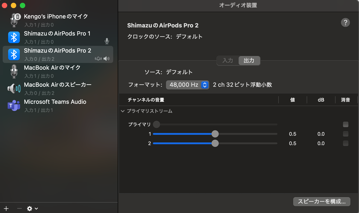 私の場合、Macに有線接続したスピーカー1台と、Bluetooth接続のスピーカー1台の組み合わせが最も良い結果になりました。