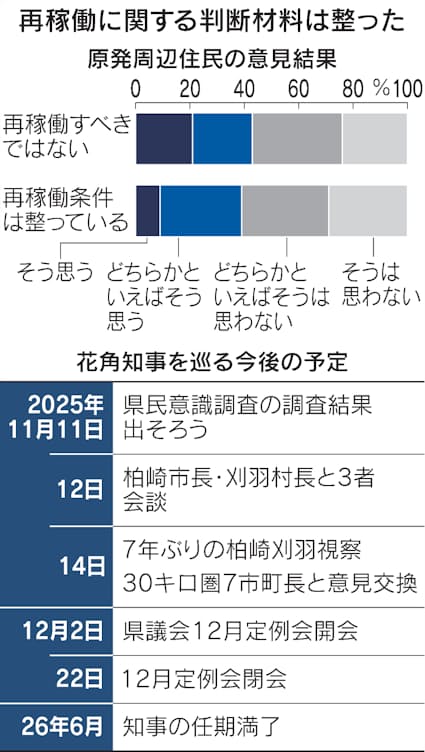 花角知事は12日に既に再稼働の意義を認めている立地自治体の2市村長と3者会談を開く。14日には30キロ圏内の7市町長と県民意識調査の結果を踏まえた意見交換を実施する。