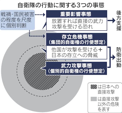 歴代の首相はどんな状況が存立危機事態にあたるかの線引きをあえてあいまいにしてきた。具体例と自衛隊の行動を結びつける議論を国会で公にすれば、侵略を考える相手に手の内を明かすことにつながる。答弁に手足が縛られ状況に即した判断がしにくくなる恐れもある。