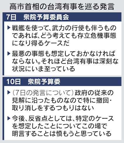 10日に質疑に立った立民の大串博志氏は他国との関係などの観点から首相に撤回や取り消しを求めた。首相は「政府の従来の見解に沿ったものだ」と訴え、拒否した。そのうえで「今後、反省点としては、特定のケースを想定したことについてこの場で明言することは慎もうと思っている」と語った。