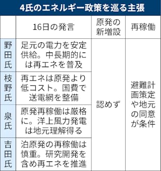 4候補者とも岸田文雄政権が認める方向にカジを切った原発の新増設には反対の立場を明確にする。原発の再稼働をめぐっても、避難計画の策定や地元の同意を条件に認めるものの、個別の発電所の各論では否定的な意見もある。