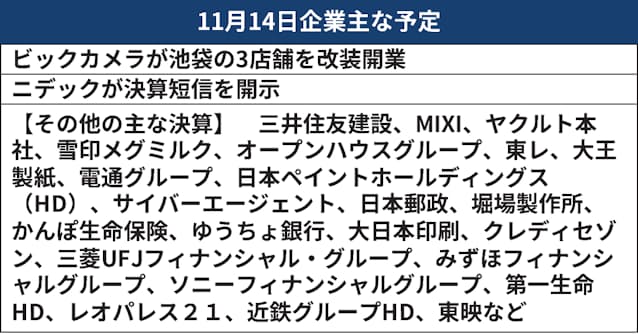 ニデックが決算短信を開示 11月14日ビジネス主な予定
