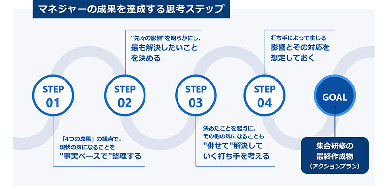 集合研修では実践に重きを置き、自組織の課題解決についてじっくりと考え、打ち手を確定します。マネジャーは日常、多忙を極めているため、どうしても短いスパン・狭い視野で対処を考えてしまいがちですが、集合研修では「組織全体を俯瞰してとらえる」、「メンバーの未来を考える」といったワークを通じて、内容の実効性を高めます。