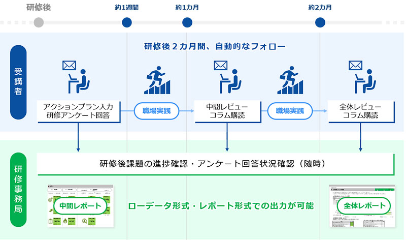 事務局が事前にスケジュール設定をするだけで、集合研修後2カ月間にわたって、自動的に受講者フォローが可能です。